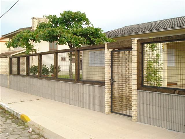 Cerca externa com portão com acabamento de madeira invernizado